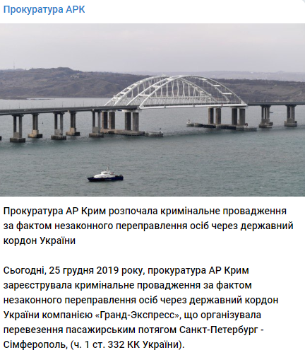 В сообщении говорится, что уголовное производство прокуратура АР Крым зарегистрировала 25 декабря по факту незаконной переправки лиц через государственную границу Украины компанией "Гранд-Экспресс" (ч. 1 ст. 332 УК Украины).