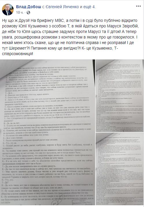 "На брифинге МВД, а затем и в суде был публично открыт разговор Юлии Кузьменко с лицом Т, в котором говорится о Марусе Зверобой, где якобы Юля что-то страшное планирует против Маруси и ее детей! А теперь внимание, расшифровка разговора с контекстом, в котором об этом говорилось. И пусть мне кто-то скажет, что это не политическое дело и не расправа! И где здесь Шеремет?!", - написал Добош в своем Facebook и выложил отсканированную расшифровку разговора.