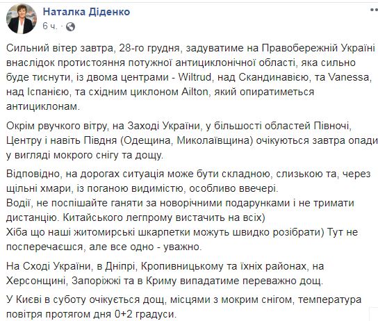Синоптик Наталья Диденко предупредила украинцев о похолодании и сильном ветре в субботу, 28 декабря. Об этом она написала в Facebook.