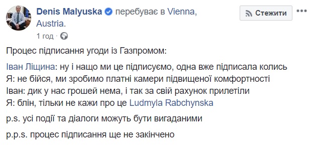 В Вене начался процесс подписания договоров между Украиной и Россией по транзиту газа. Об этом сообщил министр юстиции Украины Денис Малюська на странице в Facebook.
