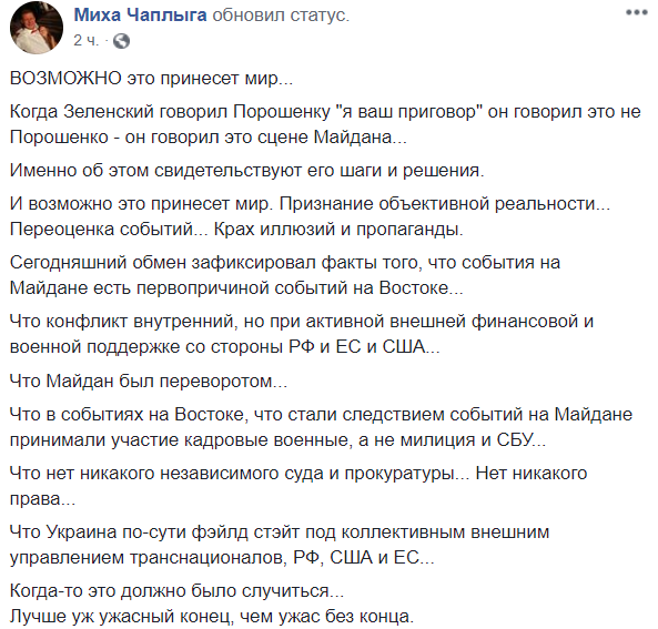 Политолог Михаил Чаплыга назвал сегодняшний обмен "крахом иллюзий и пропаганды".