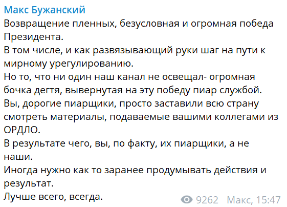 "Возвращение пленных, безусловная и огромная победа Президента. В том числе, и как развязывающий руки шаг на пути к мирному урегулированию.