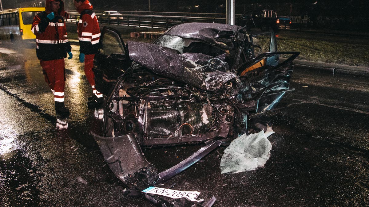 По словам очевидца, фура TATA ехала по шоссе в сторону центра и водитель решил объехать помеху справа. Его стало сносить с дороги, фура сбила отбойник и перевернулась на бок прямо на Mazda, которая двигалась по направлению в сторону Выдубичей.
