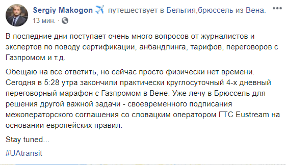 "Сегодня в 5:28 утра закончили практически круглосуточный 4-дневный переговорный марафон с Газпромом в Вене. Уже лечу в Брюссель для решения другой важной задачи - своевременного подписания мижоператорского соглашения со словацким оператором ГТС Eustream на основании европейских правил", - сообщил Макогон.