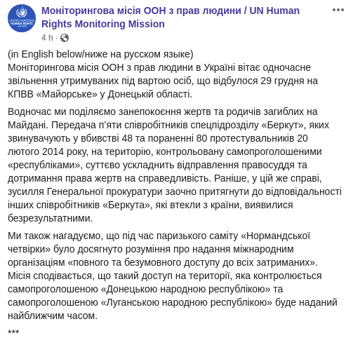 Мониторинговая миссия ООН по правам человека поприветствовала обмен пленными между Киевом и ОРДЛО, который прошел в воскресенье, 29 декабря, но они обеспокоены тем, что сепаратистам передали "беркутовцев", которых подозревают в убийствах на Майдане в 2014 году. Об этом говорится на официальной странице Facebook представительства.