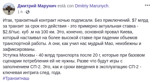 "$7 млрд за транзит за срок его действия - это примерно актуальная ставка - $2,6/тыс. куб .м на 100 км. Это, конечно, основной провал Киева, который настаивал на более высокой ставке при падении объемов транспортной работы" - написал эксперт.