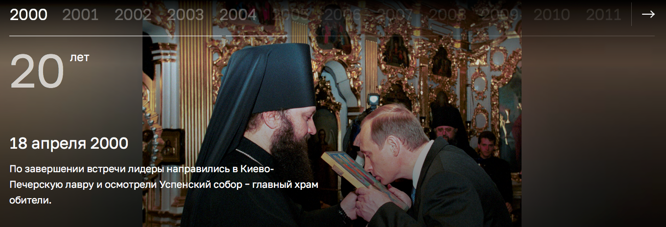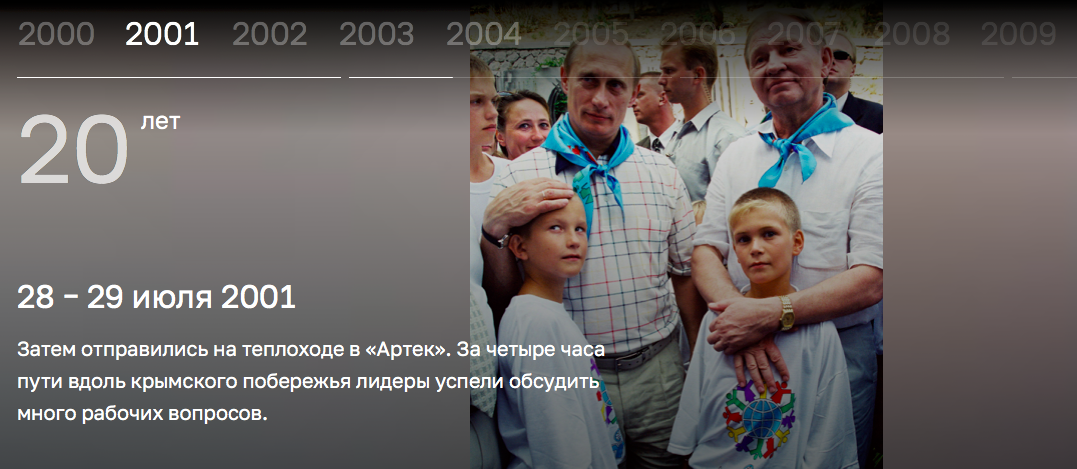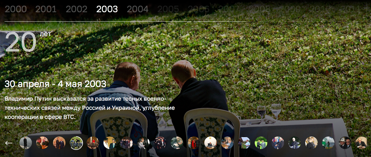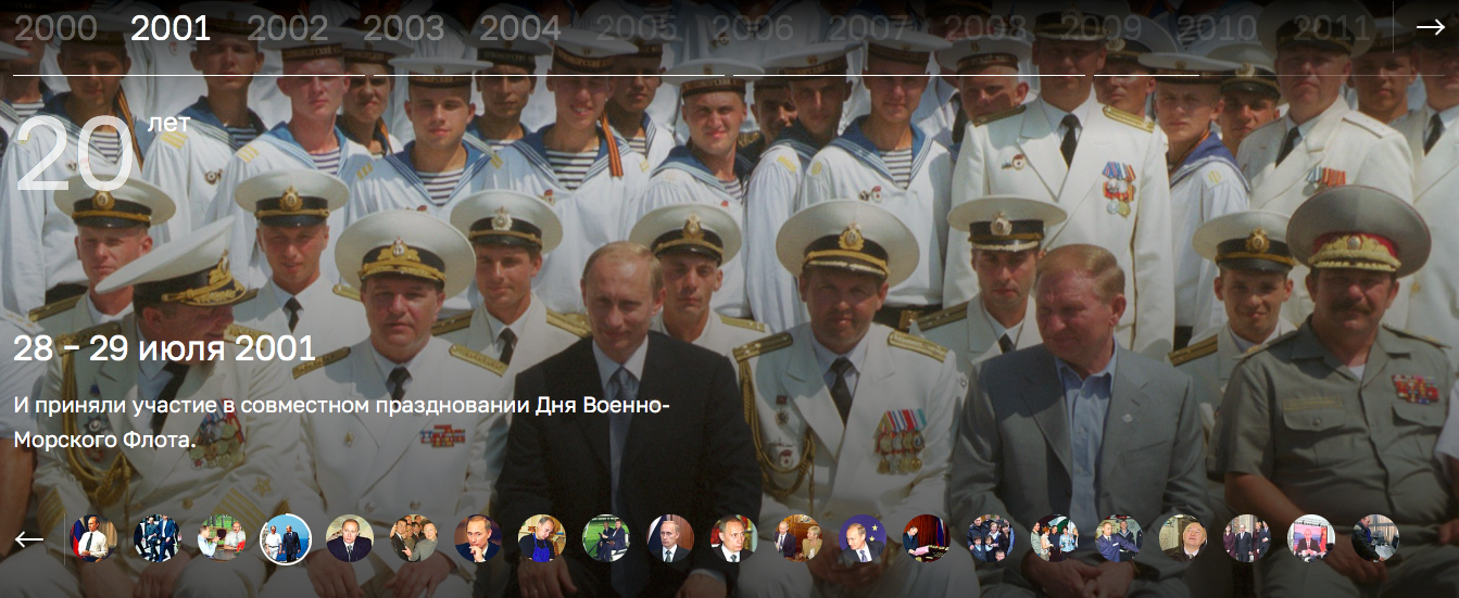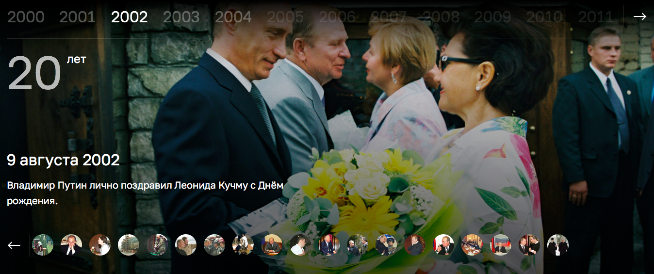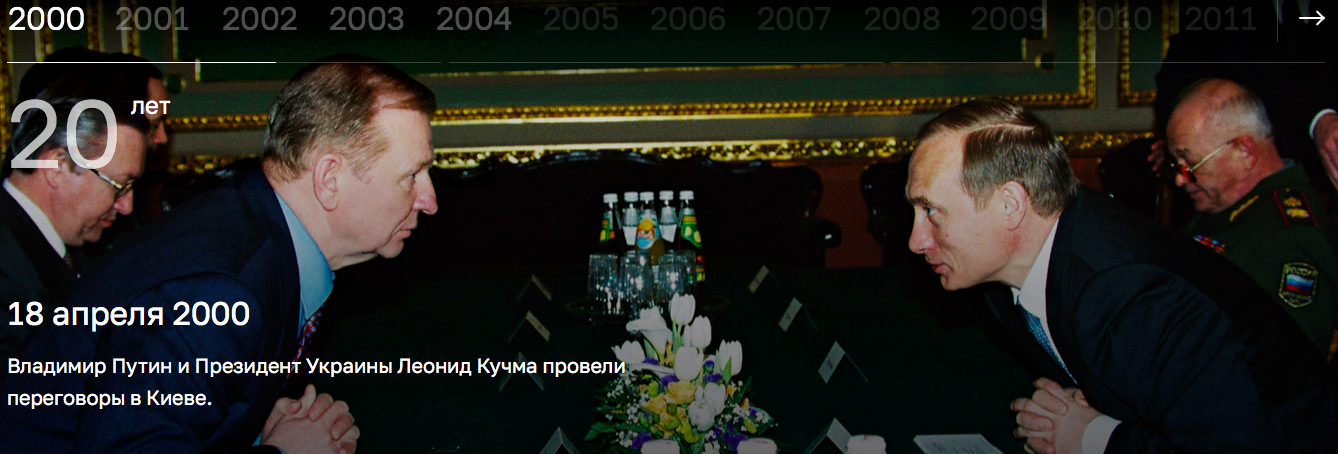 В опубликованном Кремлем фотоальбоме под названием "Путин.20 лет", приуроченном к 20-летию правления Путина, есть много фотографий с бывшим президентом Украины Леонидом Кучмой.