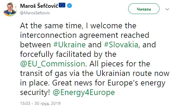 "Я приветствую interconnection agreement, заключенное между Украиной и Словакией и решительно поддерживаемое Еврокомиссией. Все части для транзита газа по украинскому маршруту сейчас на месте. Отличная новость для энергетической безопасности Европы", - написал он.