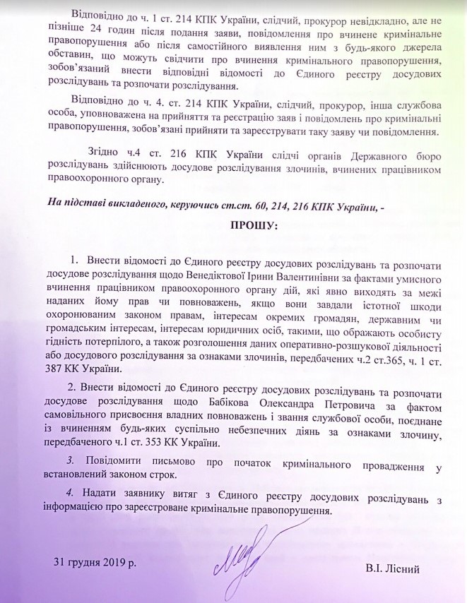 "В действиях Венедиктовой усматриваются признаки уголовного преступления, предусмотренного ч. 2 ст. 365, и ст. 387 УК Украины, то есть умышленное совершение работником правоохранительного органа действий, которые явно выходят за пределы предоставленных ему прав или полномочий, если они причинили существенный вред охраняемым законом правам, интересам отдельных граждан, государственным или общественным интересам, интересам юридических лиц, оскорбляющими личное достоинство потерпевшего, а также разглашение данных оперативно-розыскной деятельности или досудебного расследования", - отмечается в заявлении.