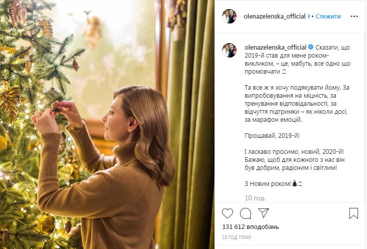 Первая леди страны Елена Зеленская поблагодарила 2019 год "за испытания прочность" и "марафон эмоций" и пожелала украинцам "доброго, радостного и светлого" 2020 года.