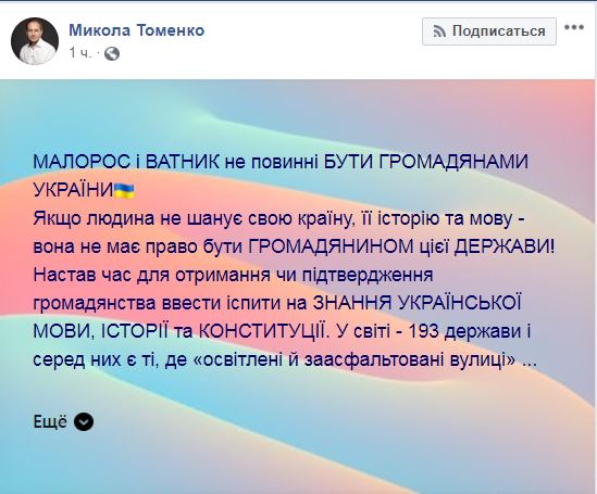 "Если человек не чтит свою страну, ее историю и язык - он не имеет право быть гражданином этого государства! Настало время для получения или подтверждения гражданства ввести экзамены на знание украинского языка, истории и Конституции. В мире-193 государства и среди них есть те, в которых "освещены и заасфальтированы улицы", - написал Томенко.
