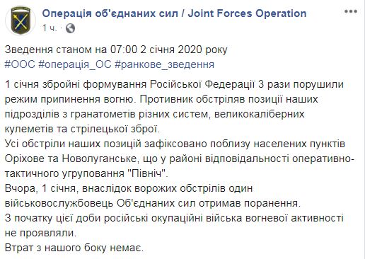"1 января вооруженные формирования Российской Федерации 3 раза нарушили режим прекращения огня. Противник обстрелял позиции наших подразделений из гранатометов различных систем, крупнокалиберных пулеметов и стрелкового оружия… в результате вражеских обстрелов один военнослужащий Объединенных сил получил ранения", – говорится в сообщении, на официальной странице штаба ООС в Facebook в четверг утром.