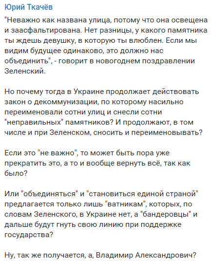 "На "какая разница" в президентском поздравлении обратили внимание многие зрители. Но еще важнее общий его месседж - нужно примирение украинцев из разных уголков страны. Выглядит вроде как красиво, но это куплет из известной песни Путина о том, что в Украине гражданский конфликт. Поэтому нам надо мириться, забыть о разнице. Поэтому для прекращения войны надо всего лишь перестать стрелять и очень захотеть мира", - иронизирует бывший глава Института нацпамяти.