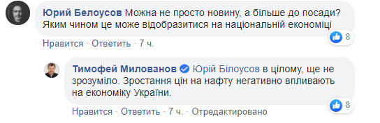 В комментариях под постом он также ответил на вопрос Юрия Белоусова, как подорожание цен на нефть отобразится на украинской экономике.