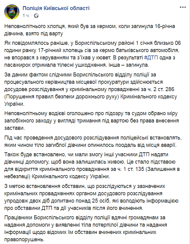 Как сообщалось ранее, 1 января около 6:00 утра в Бориспольском районе 17-летний парень сел за руль родительского автомобиля пьяным, не справился с управлением и съехал в кювет. В результате ДТП одна из пассажирок получила телесные повреждения, другая, 16-летняя девушка, погибла.