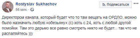 "Директором канала, который будет что то там вещать на ОРДЛО, можно было назначить любую "обезьяну" (с) хоть с 24, хоть с любой другой помойки. Там это дерьмо все равно смотреть никто не будет... так что не распаляйтесь )))" - поделился мнением журналист Ростислав Сухачев.