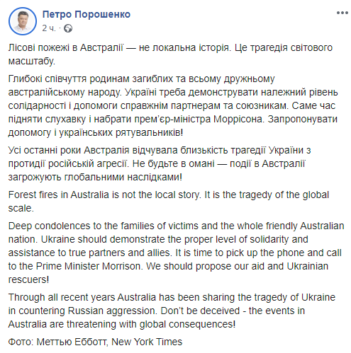 "Глубокие соболезнования семьям погибших и всему дружественному австралийскому народу. Украине нужно демонстрировать надлежащий уровень солидарности и помощи настоящим партнерам и союзникам. Самое время поднять трубку и набрать премьер-министра Моррисона. Предложить помощь и украинских спасателей!" - написал Порошенко в соцсети.