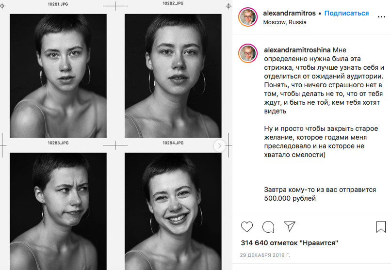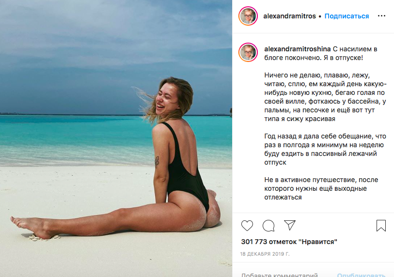 Для понимания тематики Instagram Александры приведем несколько постов: о стрижке, стандартах красоты, снимки с отдыха в купальнике.
