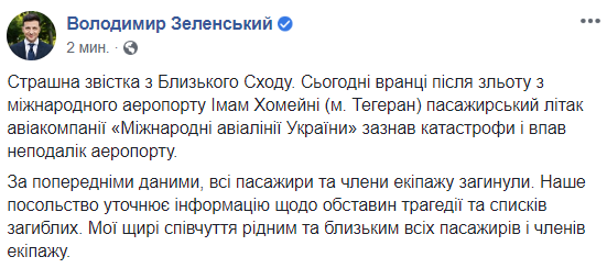 По предварительным данным, все пассажиры и члены экипажа погибли. Наше посольство уточняет информацию об обстоятельствах трагедии и списков погибших. Мои искренние соболезнования родным и близким всех пассажиров и членов экипажа", - написал Зеленский в Facebook.