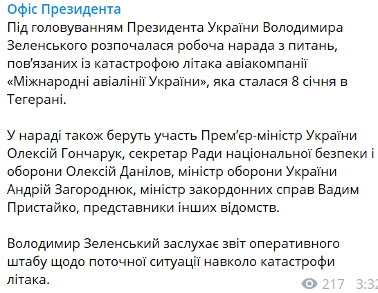 Президент Владимир Зеленский, который сегодня ночью вернулся с отдыха в Омане, проводит экстренное совещание по катастрофе украинского "Боинга" в Иране.