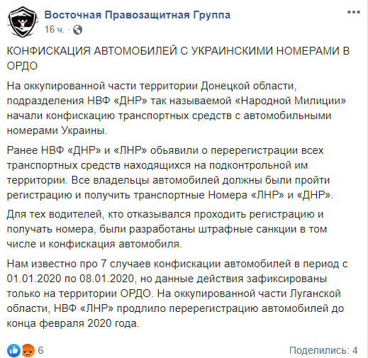 "Для тех водителей, кто отказывался проходить регистрацию и получать номера, были разработаны штрафные санкции, в том числе и конфискация автомобиля. Нам известно о 7 случаях конфискации автомобилей в период с 01.01.2020 по 08.01.2020, но данные действия зафиксированы только на территории ОРДО", - говорится в сообщении.