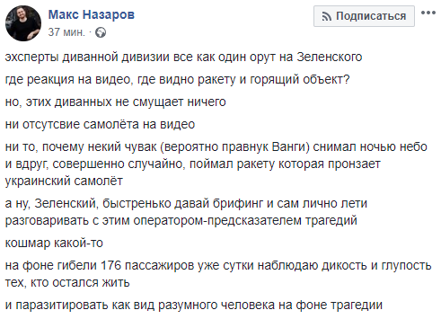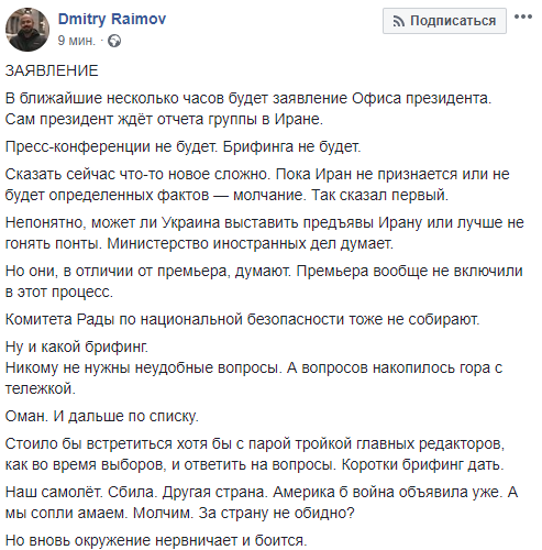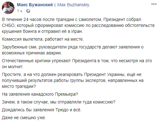 "В сухом остатке ... Прошло уже 4:00 с момента, когда в западных источниках появилась информация, что украинский самолет был сбит российской ракетой. Эту информацию подтвердил Трюдо, была осторожна, но поняла заявление Трампа. Что мы услышали от украинской власти за это время? Ничего. Позорное молчание. Абсолютная неспособность реагировать на кризисные ситуации. И это о всей системе так называемой власти - Офис президента, СНБО, СБУ, МИД ...