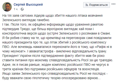 "На фоне заявлений мировых лидеров по сбивания нашего самолета молчания Зеленского выглядит позорно. И так. После того, как официально информацию о поражения ракетой подтвердил Трюдо, еще более вероятной выглядит пусть пока и конспирологическая версия о встрече Зеленского с россиянами в Омане.