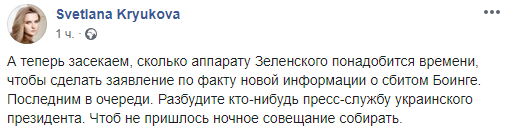 "А теперь засекаем, сколько аппарату Зеленского понадобится времени, чтобы сделать заявление по факту новой информации о сбитом Боинге. Последним в очереди. Разбудите кто-нибудь пресс-службу украинского президента. Чтоб не пришлось ночное совещание собирать" - написала заместитель главного редактора "Страны" Светлана Крюкова.