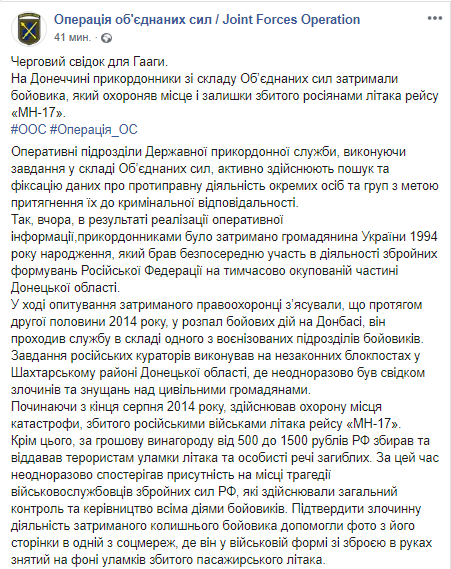 Штаб ООС объявил о задержании на Донбассе "свидетеля для Гааги" по депу МН-17