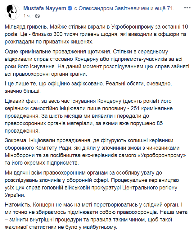"Миллиард гривен. Почти столько украли в "Укроборонпроме" за последние 10 лет. Это около 300 000 гривен в день, которые выводили в оффшоры и раскладывали по частным карманам. Одно уголовное производство еженедельно. Столько в среднем открывали дел в отношении концерна или предприятий-участников за все годы его существования. На данный момент расследованием этих дел заняты все правоохранительные органы страны", - констатировал экс-нардеп.