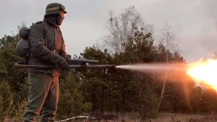 На третьем видео этот же огнеметчик дает залп из своего оружия.