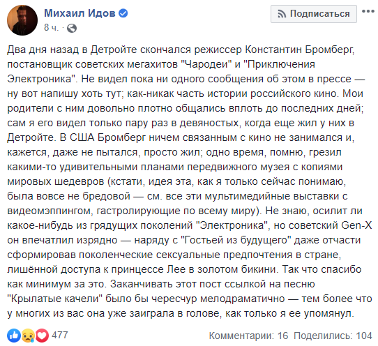 "Два дня назад в Детройте скончался режиссер Константин Бромберг, постановщик советских мегахитов "Чародеи" и "Приключения Электроника", - написал Идов. По его словам, после эмиграции в США Бромберг "ничем связанным с кино не занимался и, кажется, даже не пытался".