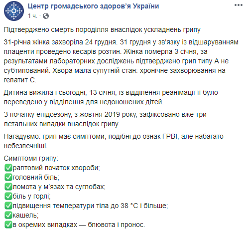 Центр общественного здоровья Министерства здравоохранения Украины сообщил о смерти беременной женщины в результате осложнений гриппа. Об этом сообщает ЦОЗ на странице в Facebook.