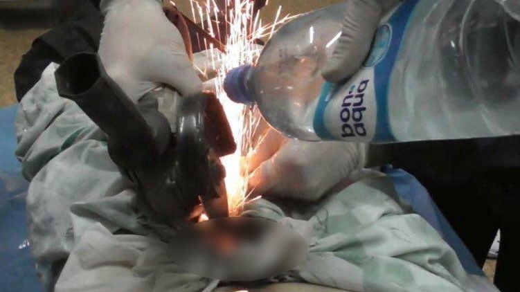 "Мы часто этим занимаемся: это кольца, то наручники, то еще что-то. Опыт с кольцами есть, здесь в принципе та же ситуация. Под надпиленную поверхность, между нею и телом, подкладывается металлический предмет: щуп или от ножовки по металлу полотно. И сверху начинаем резать. Перепилили с одной стороны, перевернули, перепилили с другой стороны, две части разняли - и все. Человеку спасли писюн в общем-то, детородный орган", - похвалился результатами отлично проделанной работы спасатель.