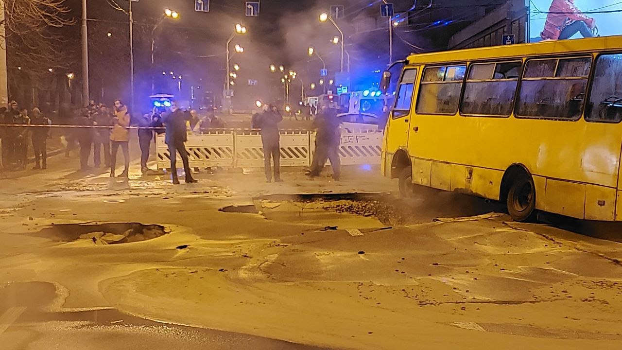 Горячая вода растекается по улице возле Антоновича, 176, где расположен ТРЦ.