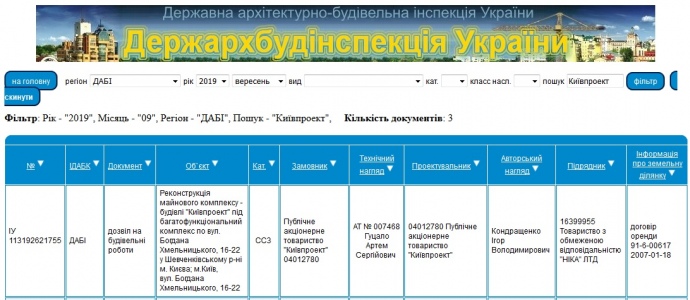 Согласно сайту Госархстройинспекции, ГАСИ выдал разрешение на строительные работы на объекте "Реконструкция имущественного комплекса – здания "Киевпроект" под многофункциональный комплекс по ул. Богдана Хмельницкого, 16-22 в Шевченковском районе Киева" в сентябре 2019 года.