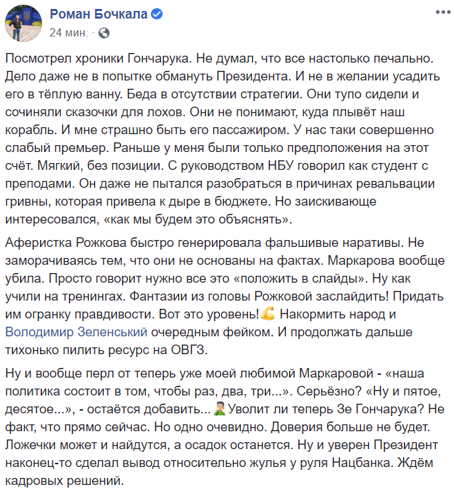"Посмотрел хроники Гончарука. Не думал, что все настолько печально. Дело даже не в попытке обмануть Президента. И не в желании усадить его в тёплую ванну. Беда в отсутствии стратегии. Они тупо сидели и сочиняли сказочки для лохов. Они не понимают, куда плывёт наш корабль. И мне страшно быть его пассажиром. У нас таки совершенно слабый премьер. Раньше у меня были только предположения на этот счёт. Мягкий, без позиции. С руководством НБУ говорил как студент с преподами. Он даже не пытался разобраться в причинах ревальвации гривны, которая привела к дыре в бюджете. Но заискивающе интересовался, "как мы будем это объяснять".