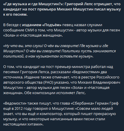 Позже Григорий Лепс прокомментировал сообщения о том, что кандидат на должность премьер-министра России и глава Федеральной налоговой службы Михаил Мишустин якобы выступил автором двух его песен. Его словам приводит Telegram-канал "Подъем".