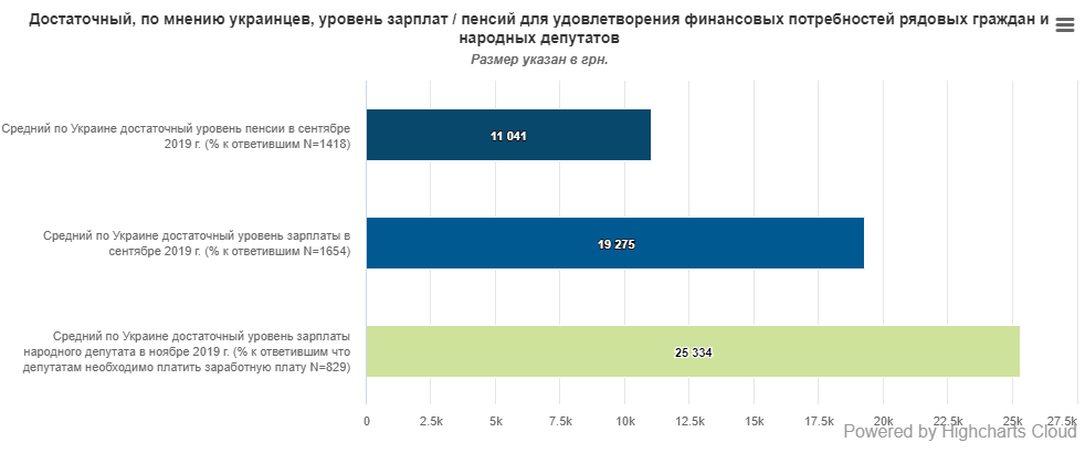 Уровень зарплаты народного депутата Украины, достаточный для удовлетворения финансовых потребностей, по мнению опрошенных, должен составлять 25 334 грн. При этом средний уровень пенсии должен быть 11 041 грн, а средний по Украине достаточный уровень зарплаты - 19 275 грн (на в сентябрь 2019 г.)
