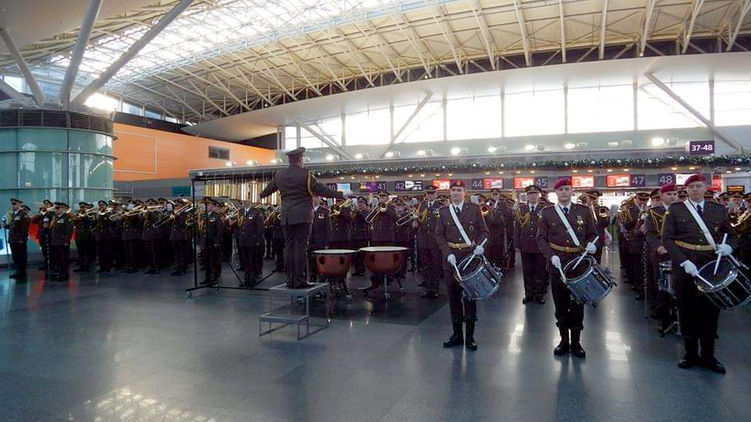 В терминале "D" киевского аэропорта "Борисполь", 20 января, в честь Дня памяти защитников Донецкого аэропорта состоялось выступление Национального президентского оркестра и хора Ансамбля песни и танца Вооруженных Сил Украины.