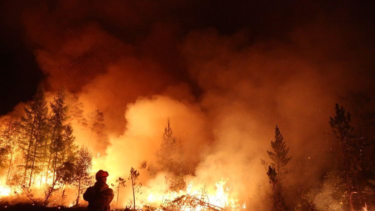 Неподалеку от границы Киева, примерно в 20 километрах, возле Киевского моря горит луг. Сильный ветер разгоняет огонь, чем помогает горению. Дым от пожара несет в сторону столицы.