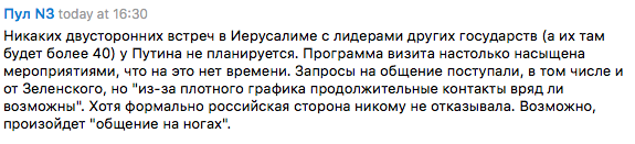 "Никаких двусторонних встреч в Иерусалиме с лидерами других государств (а их там будет более 40) у Путина не планируется. Программа визита настолько насыщена мероприятиями, что на это нет времени. Запросы на общение поступали, в том числе и от Зеленского, но "из-за плотного графика продолжительные контакты вряд ли возможны". Хотя формально российская сторона никому не отказывала. Возможно, произойдет "общение на ногах", - сообщал телеграм-канал.