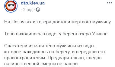 Сегодня, 26 января, в озере Утиное на Позняках, в Киеве, было обнаружено тело мертвого мужчины.