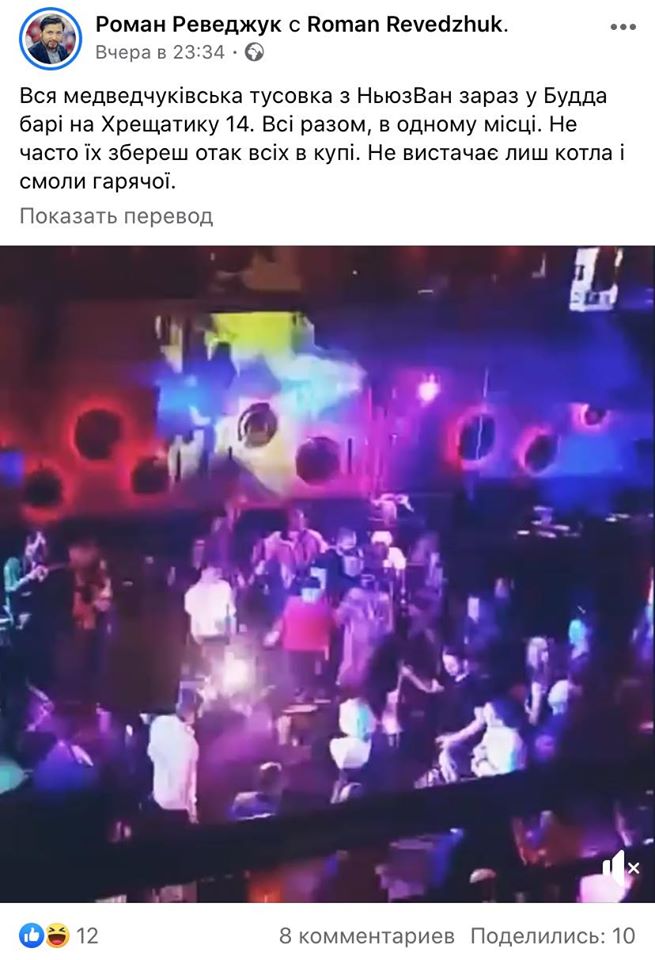 "Вся медведчуковская тусовка с НьюзВан сейчас в Будда баре на Крещатике, 14. Все вместе, в одном месте. Не часто их соберешь так всех в куче. Не хватает лишь котла и смолы горячей", - написал он.