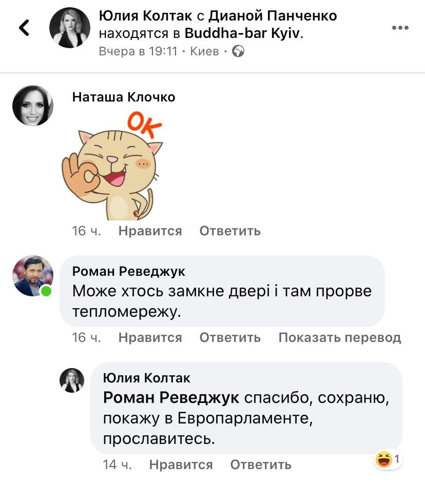 В ответ на это, телеведущая NewsOne Юлия Колтак рассказала, что хочет показать призывы к насилию со стороны Реведжука депутатам Европарламента.