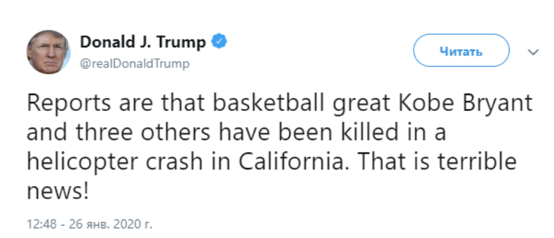 Мелания и я посылаем наши самые теплые соболезнования Ванессе (жена Коби Брайанта - Ред.) и замечательной семье Брайанта. Да пребудет с вами Бог!", - написал Трамп в своем Twitter.