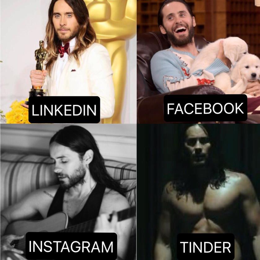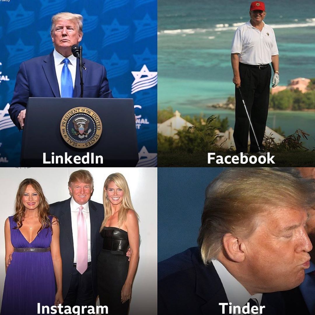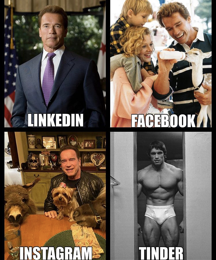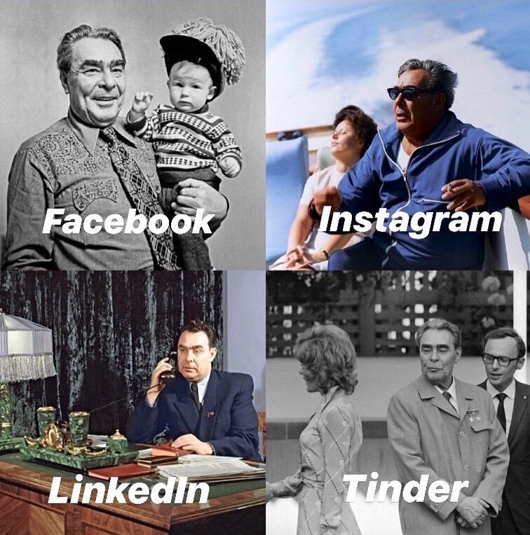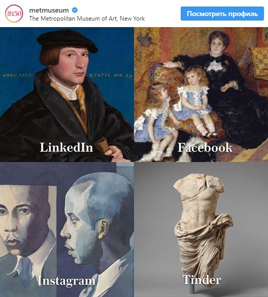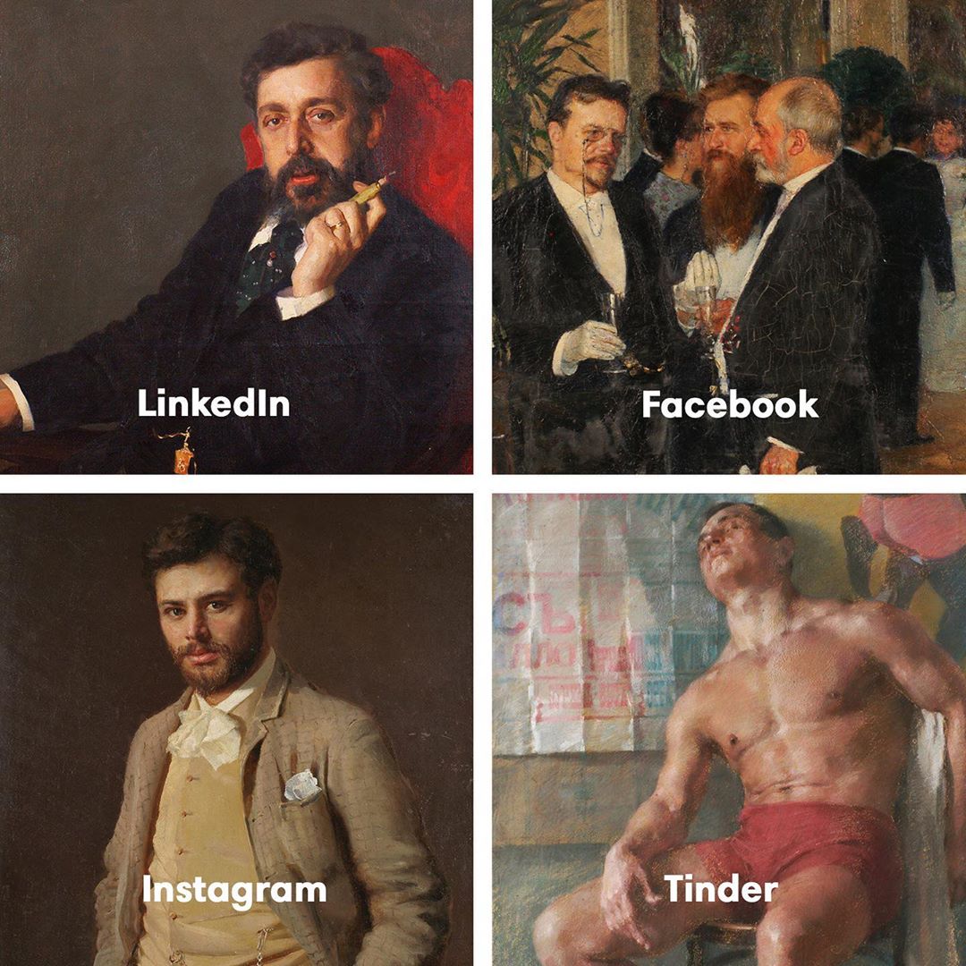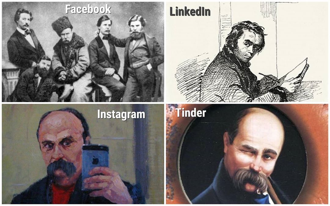В соцсетях набирает обороты новый флешмоб. Пользователи постят коллажи из своих фотографий в разных образах для четырех соцсетей: Linkedin, Facebook, Instagram и Tinder. В флешмобе засветились украинские и мировые звезды, уже появились фотожабы на политиков, а на этой неделе поддержать модное течение решили и в украинских музеях.