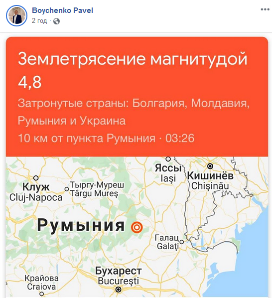 Депутат Одесского областного совета Павел Бойченко в Facebook сообщил, что землетрясение ощутили около 04.00 в Белгород-Днестровском Одесской области.