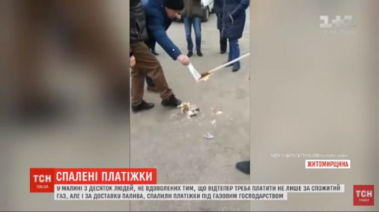 В Малине Житомирской области несколько десятков активистов сожгли платежки за доставку газа напротив Управления газового хозяйства города. Люди отказываются оплачивать услуги за доставку газа и требуют у правительства отменить новацию.