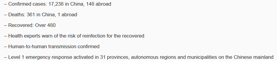 За сутки число заразившихся увеличилось по стране на 2 829 человек, смертельных случаев - на 57. Из них в провинции Хубэй, являющейся эпицентром распространения коронавируса, скончалось 56 человек, один - в городе Чунцине.